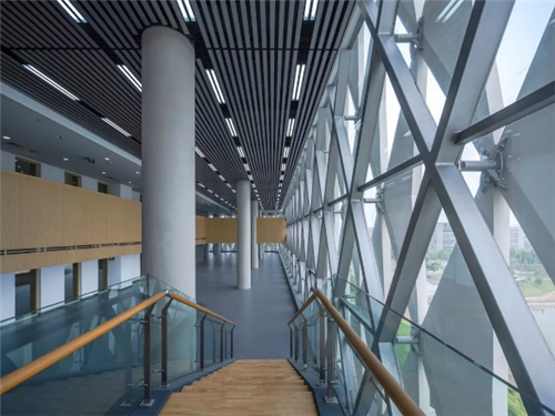 圖書館室內(nèi)透視,GRC材料自身強(qiáng)度較高,結(jié)構(gòu)設(shè)計(jì)構(gòu)造簡(jiǎn)潔、通透,增加的一層表皮使得立面設(shè)計(jì)更豐富
