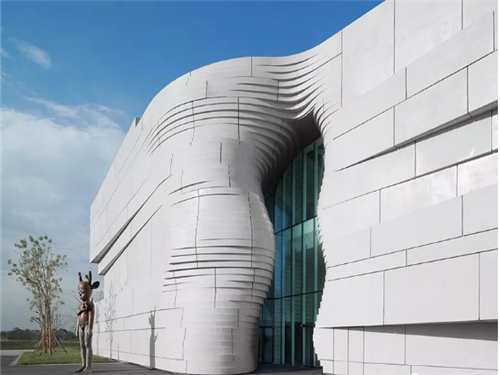 建筑立面設(shè)計(jì)大量采用不規(guī)則、無規(guī)律的線條來表現(xiàn),藝術(shù)美術(shù)館整體建筑呈長(zhǎng)條狀,為充分體現(xiàn)出橫向的線條設(shè)計(jì)感,立面裝飾的每塊板的分格需要較大,GRC板是理想的替代材料,最大板塊橫向長(zhǎng)度達(dá)到近4米,這是其他材料(如石材、水晶石、人造板等)無法做到的。